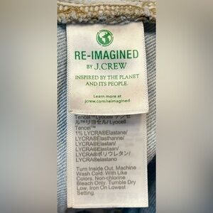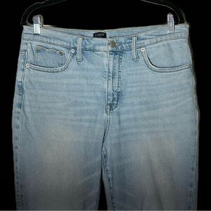 J. Crew Factory Essential Straight Jean in Light Wash with Blown-Out Knees, Size 31. Sits at waist.