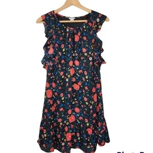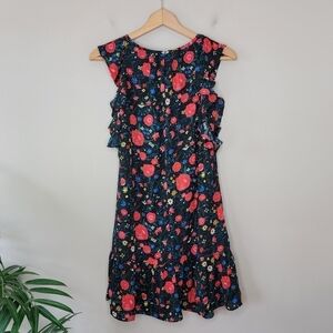 Beautiful floral print sleeveless dress with ruffled armholes and keyhole front. Lined.