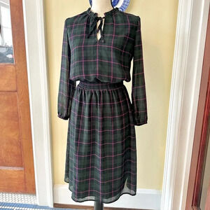 J. Crew Factory | Green & Pink Tartan Plaid Long Sleeve Dress w/Tie Neck