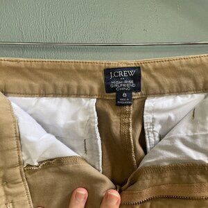 J. Crew Factory high-rise girlfriend chino. Size 8. Color is tan, best represented in main photo and the close-up of the tag. These have an oversized, relaxed fit. Excellent used condition, no flaws noted.