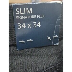 The product is a pair of J. Crew Factory Men's Slim Fit Signature Flex Black Jeans in size 34x34. These jeans feature a solid black color with a dark denim fabric wash. Made of a cotton blend with elastane for stretch, they have a slim fit and a 5-pocket design. The style is described as slimming and they are designed for a regular size Type. The brand is J. Crew, and the product line is J. CREW Factory. These jeans are a stylish choice for men looking for a sleek and modern pair of denim pants.retails for $98