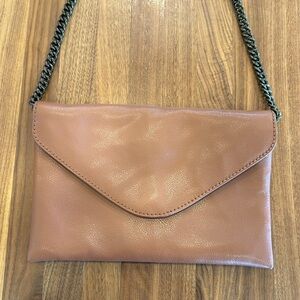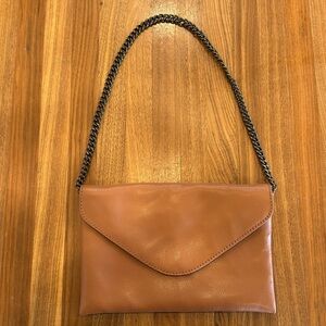 J. Crew Factory saddle brown leather invitation envelope purse with magnetic snap closure, gunmetal chain strap, exterior snap pocket and interior pocket. Can be worn as a clutch or shoulder bag.