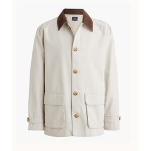 Features: Barn jacket, button front, corduroy collar, flap pockets, lined, adjustable button cuffs, khaki