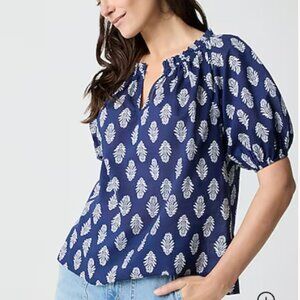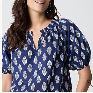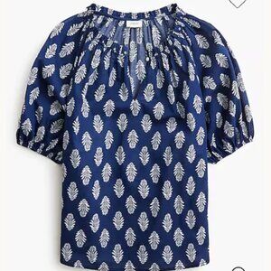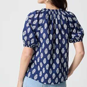 J Crew Factory Printed Puff-Sleeve Split-Neck Top in Antique Navy