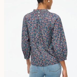 J Crew Factory Printed Smocked-Neck Top Size XS Floral Navy Autumn High Neck
