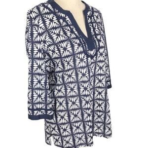 J. Crew Factory Printed Tipped V-Neck Tunic Coverup Tunic Blouse Blue White Print Womens Size Small