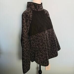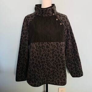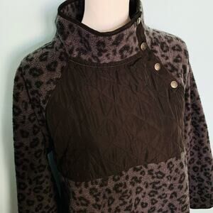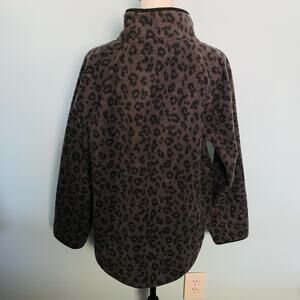 This fleece jacket features a charcoal leopard print with a quilted design and a comfortable mid-length fit. Made with a cozy fleece fabric, it provides warmth and comfort during outdoor activities. The long-sleeved jacket has a collared neckline with a snap closure, making it a great casual option for cooler weather. In excellent used condition