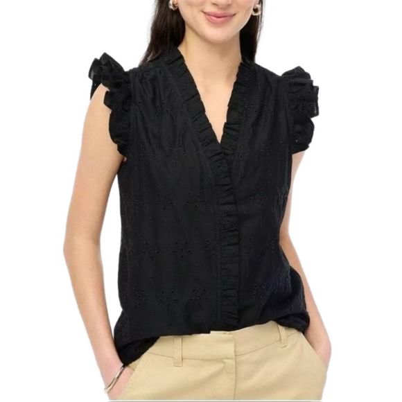 Elevate your wardrobe with this charming J. Crew Factory Sleeveless Ruffle Eyelet Top in classic black, Size Medium! This stylish piece features delicate eyelet detailing and a feminine ruffle design, adding a touch of elegance to any ensemble.