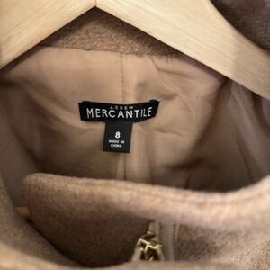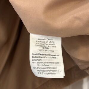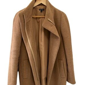 Cozy up in stylish tan city coat. Features a high collar and front pockets. Perfect for cool weather. Gold zipper makes for a stylish accent.