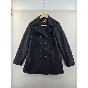 Stylish tan pea coat. Features a belted waist. Perfect for layering.