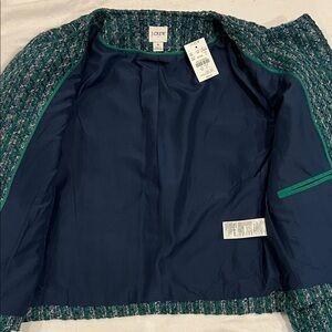 Elegant J. Crew tweed jacket in teal with striking gold buttons. Ideal for a sophisticated style.