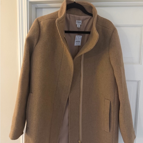 Elegant camel trench coat from J. Crew Factory. Features a sleek design with a high collar. Ideal for layering in cooler weather.