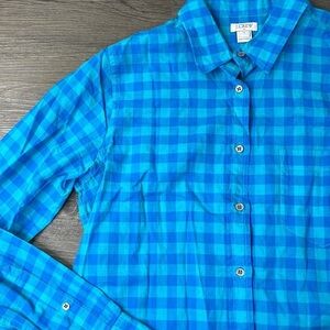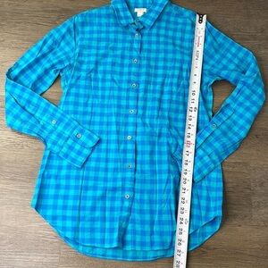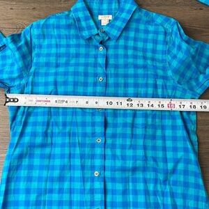 J. Crew Factory Women’s Gingham Classic Button Down Shirt, Blue and Teal, sz Sm. In great used conditon. See pictures for measurements and fabric content.