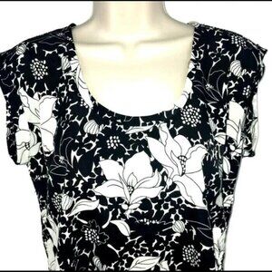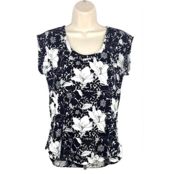 J. Crew Factory Short Sleeve Top in size 2. Scoop neck, sleeveless, 100 % Polyester. Black and white floral pattern. Great condition, no flaws.