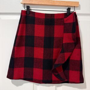 Classic and updated wool blend skirt by J. Crew Factory. Deep red and black large check buffalo plaid design with large ruffle detail on front left side. Hidden back zipper and fully lined with red silky fabric.