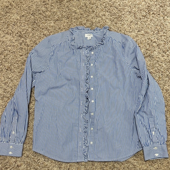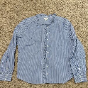Never worn, J. Crew Factory blue/white stripe button down. Ruffled around neck and ruffled around button holes, no collar. Length from shoulder to bottom is approx 25” and armpit to armpit is approx 20”
