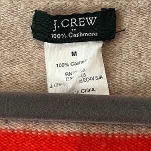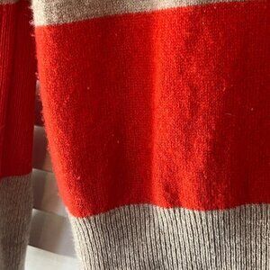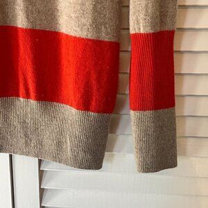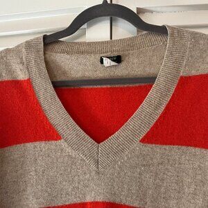 J. Crew Factory women's v-neck sweater, red and camel striped. 100% cashmere. Gently worn, in very good used condition. Minor pilling especially at sides and under arms. See photos. No rips or stains.