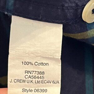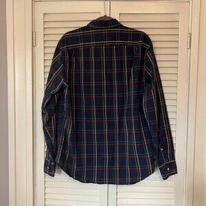 J. Crew Factory men's buttondown shirt, size large. 100% cotton. Navy plaid with blue, red, and yellow. Gently worn, in good used condition. A loose thread or two around the buttons. Nice worn-in look and feel. See photos. No rips or stains.