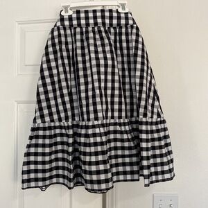 Timeless J. Crew Factory black and white gingham skirt. Size 0. NWT. Midi length with fabulous ribbon/bow that ties in the back. Zips and clasps in the back. Full skirt with ruffles on the bottom.