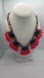 navy blue, hot pink, statement necklace, beaded jewelry, gold chain, fringe design, bold accessory, colorful jewelry, statement adornment, fashion jewelry
