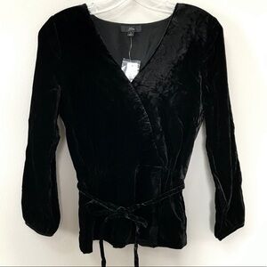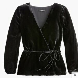 Brand new with tags J. Crew Faux Wrap Top in Drapey Velvet. Black. Size 0. Fully lined. Button at sleeve hems. Removable tie. Zips at side. 75% viscose, 25% polyamide. Style J4962. Retails for $98.