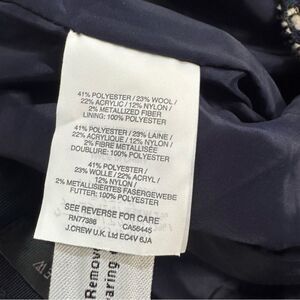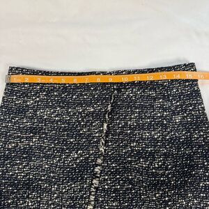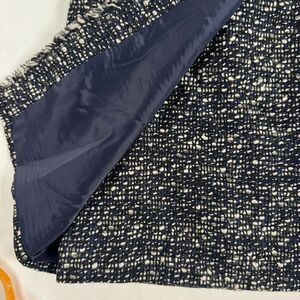 Fringe detail, slit up back. Metallic tweed. Navy blue, black and silver thread. Wool blend.