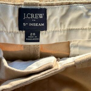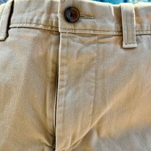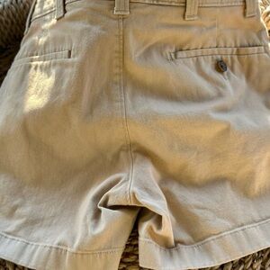 Classic khaki shorts with a flat front design. Features a button closure in the front and on the back pocket. In great condition! Thanks for looking!