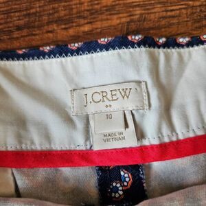 This is a pair of Chino style shorts by J. Crew. They are navy blue and orange with geometric floral and paisley filigree print. On each side is a pocket, and there is a side zipper with a hidden inner clasp.