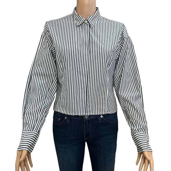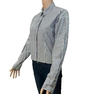 Button down shirt. Fitted waist. Lightly cropped. Striped. Stretchy poplin material.