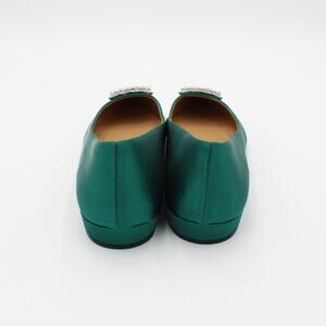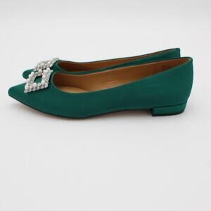Jeweled flats in deep emerald green satin with pearl and crystal buckle accents. Elegant J Crew pointed toe silhouette with low block heel and smooth lining. Perfect for parties weddings or holiday events.