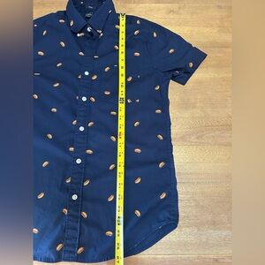 Blue button down shirt with cute hot dog print. Made of 98% cotton. Perfect for summer