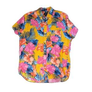 J Crew Flex Washed Slim Hawaiian Shirt Floral Yellow Pink Beach BBQ Preppy Large