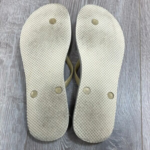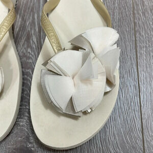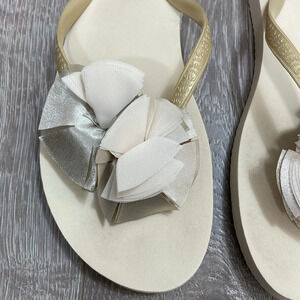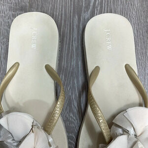 J. Crew Flip Flop Sandals Floral Accent in size 8. Good preowned condition. Off white with gold straps, floral accent is made of layers of chiffons and satin. Please see photos for details. Item may show difference in color based upon photography and perception. Photos are part of the description, as everyone’s level of condition may vary. From smoke free and pet free home. All packages are shipped the same or next business day.