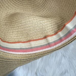 J Crew Floppy Wide Brim 5" Beach Paper Straw Hat Striped Blue & White Band. A beautiful summer hat to wear to the beach or out gardening. The wide brim is great to protect you from the sun's rays. There is a light discoloration on the inside front band, but not visible from the outside, please see images.