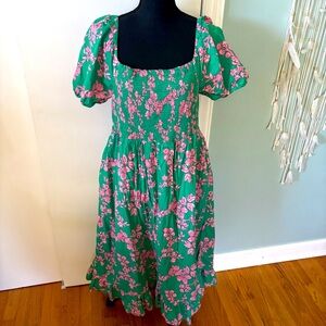 Embrace elegance with this stunning JCrew floral dress. Featuring a vibrant green base adorned with pink floral patterns, this dress is perfect for any occasion. The puff sleeves add a touch of sophistication. A must-have addition to your wardrobe. Dress has pockets