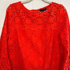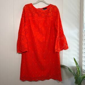Features: Chic, universally flattering shift silhouette gets a bold update in a striking orange from J. Crew. Feminine eyelet with floral detailing and bohemian scalloped bell sleeves add interest. Side zip closure with buttons at the back.
