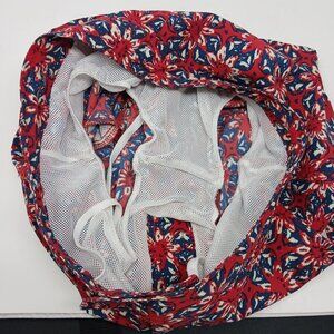 Bold floral design in red and blue adds a vibrant touch to summer outings. Lightweight with mesh lining for comfort and quick drying.