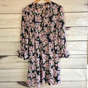 Features: flowy, ruffle sleeves, boho, chic, cinched waist, semi sheer, floral print