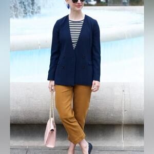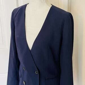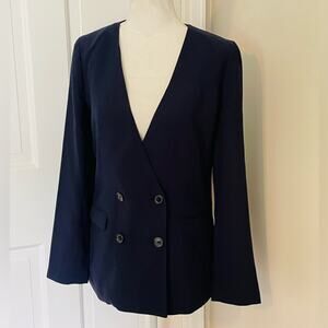 Navy blue double breasted blazer. Collarless. Super chic !!