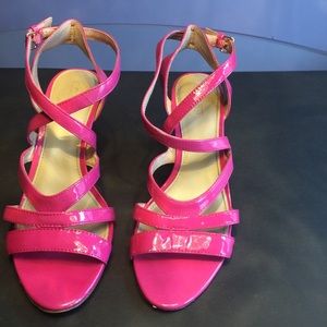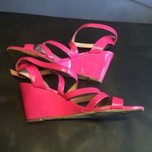 J. Crew fuchsia patent leather wedge high heel sandals. Gently worn about twice. In picture #4 you can see some markings that transferred onto shoe while stored. Please send your offers. Very comfortable shoes.