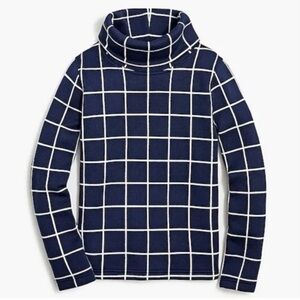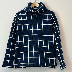 J Crew Funnel Neck Pullover Fleece Lined Windowpane Sweater Women's Small Navy