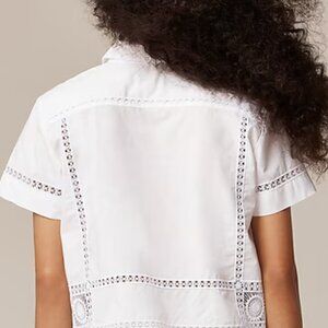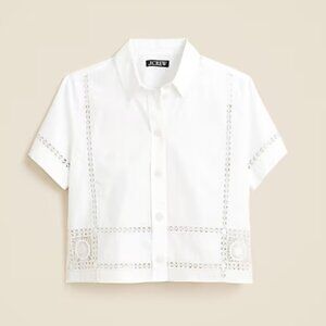 This short-sleeve shirt is subtly cropped with intricate panels of crochet detailing along the front, hem and sleeves.
