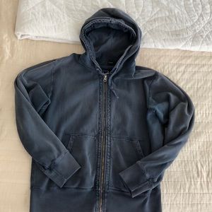 Navy sz L. Because this hoodie is garment dyed, it will have a perfectly imperfect color and will softly fade over time. It's made from the finest variation of terry cloth, french terry, which is knitted from two separate yarns—one that stays taut, and another that creates the loose loops, called "piles," on the back of the fabric.