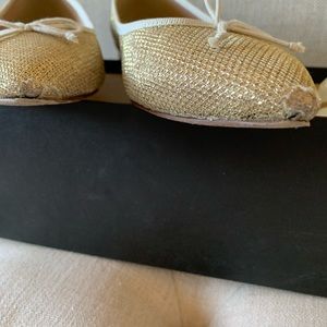 Fun gold/sand colored flats to spice up an outfit for work or a night out! Pointed toe has some scuffing (see pics) but the shoe are in great shape - only worn a handful of times. Size 6.5 (EU 37) and true to size. Comes with original box.