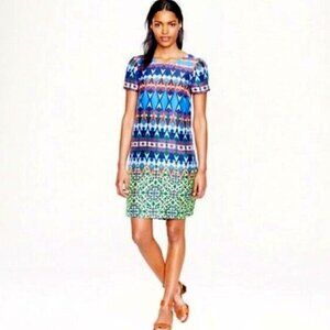 Stunning J. Crew short sleeve mini dress crafted from high quality 100% silk! Beautiful vibrant color combination - blue, green, orange, purple, grey, and black. Fun, artsy mosaic / geometric pattern. The shift cut is loose through the waist and is extremely body-flattering. Fully lined. Scoop neckline. Hidden back zipper. Truly versatile style that's appropriate for everyday wear or special occasion.