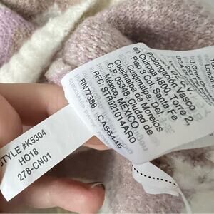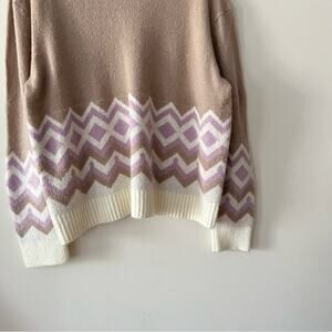 In good preowned condition. Brown, Lavender, and Ivory color combo featuring a geometric print. Crewneck. Soft, wool blend material.