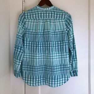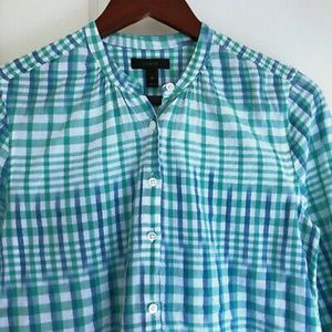 J. Crew Gingham Ikat Popover Shirt Plaid Long Sleeve Collarless Blue Size 2P Petites G5186