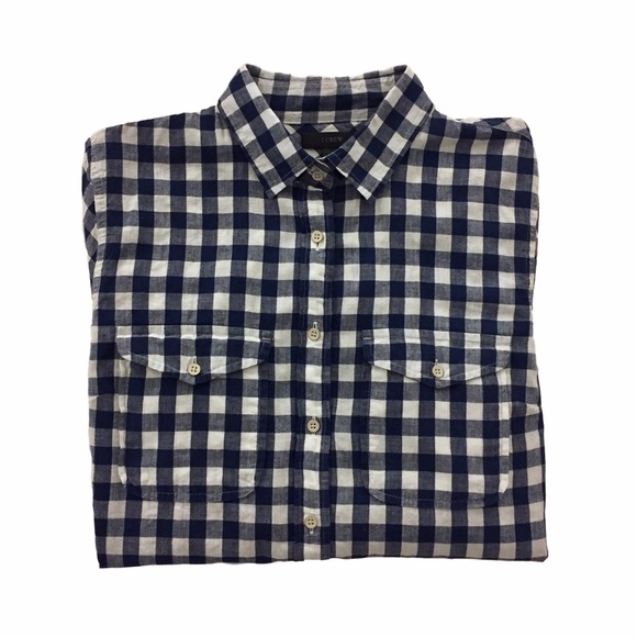 J. Crew's gingham utility shirt - a style from 2014. Cotton and linen, with long roll up sleeves, chest pockets, and metal buttons. A classic shirt in great condition.