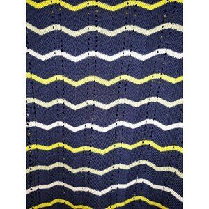 Pre-owned J. Crew Girls Knit Sweater, size Large (L). Features a fun zigzag stripe pattern in navy blue, yellow, and white, with a crew neckline and ribbed cuffs and hem. Lightweight yet warm — perfect for school or casual wear.