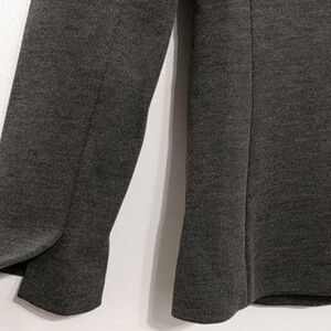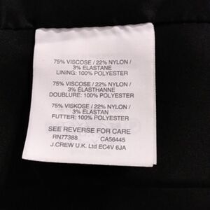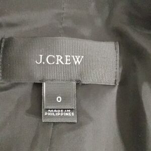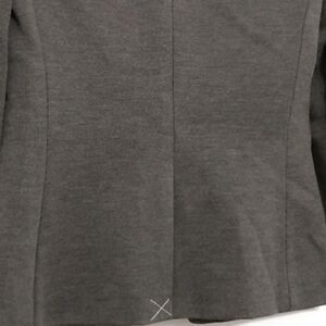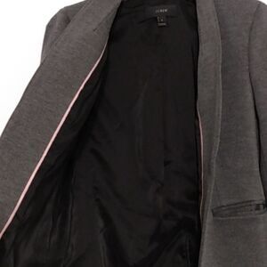 Sleek, tailored blazer from J.Crew. The jacket features a minimalist design with a clean, structured silhouette. It has a deep V-neck collar, giving it a modern, sophisticated look. The blazer is made of a smooth, dark gray fabric with a subtle texture, adding depth without being overly bold. The front is open, with no buttons or closure, which contributes to its sleek, streamlined appearance. It has two slit pockets on either side at the waist, enhancing the smart look and a notch collar. The simple yet refined style makes it perfect for both professional and casual wear. Back hem vent(Still sewn shut). Fully lined. 75% Viscose, 22% Nylon, 5% Elastane